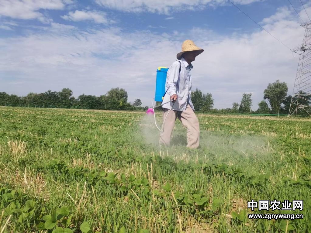 ??农民正在陕西省岐山县凤鸣镇水泊村一处大豆田进行防虫作业。新华社记者 刘彤 摄